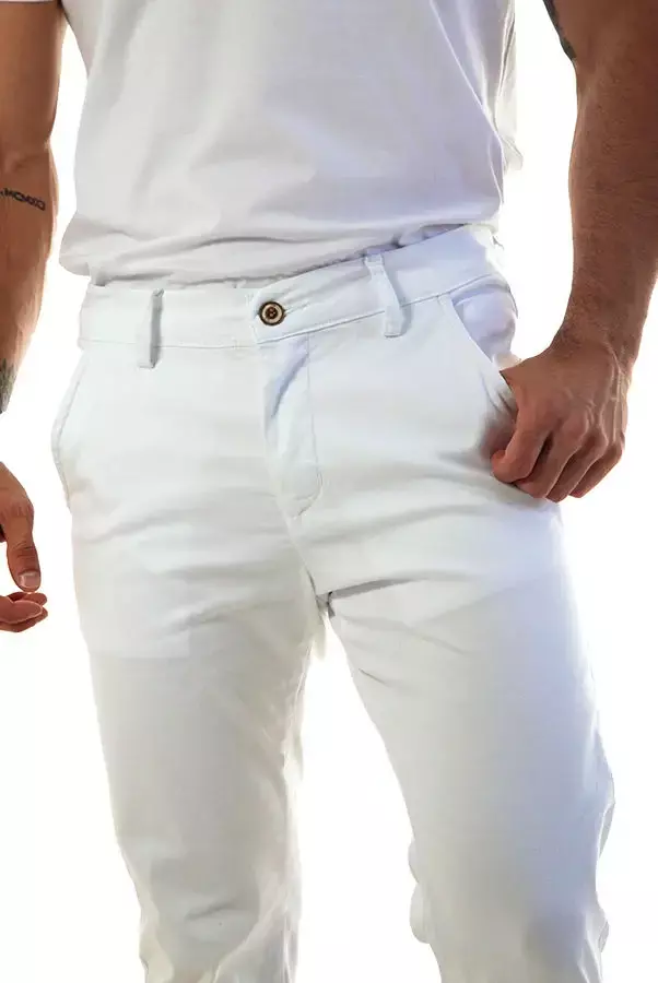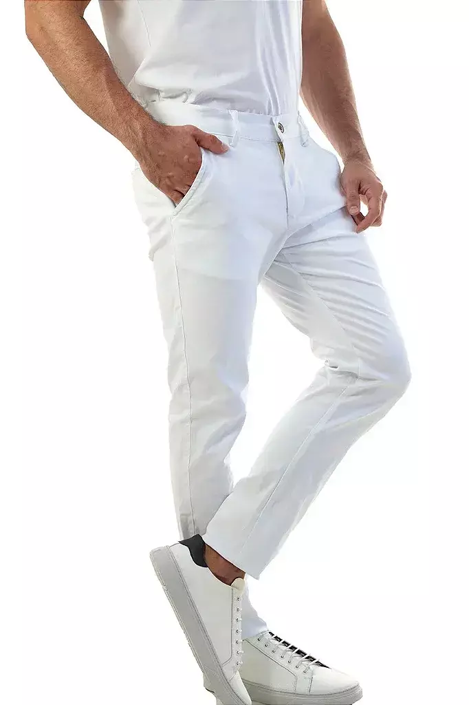 O design slim, com bolsos faca e acabamento interno de alfaiataria refinada, proporciona caimento impecável e versatilidade para composições que vão do trabalho aos eventos casuais elegantes. Sua composição de 98% algodão e 2% elastano garante conforto, mobilidade e ajuste perfeito ao corpo.
